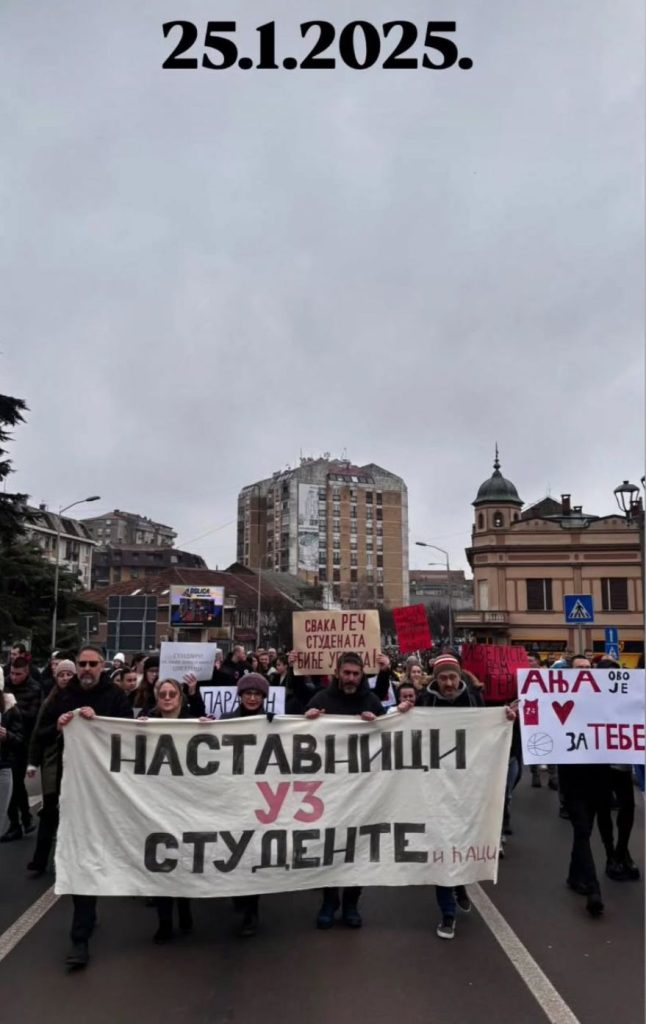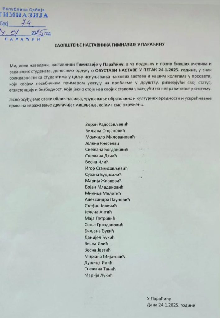 Posebnu zahvalnost dugujemo nastavnicima Gimnazije u Paraćinu koji su,obustavom rada 24 januara,stali uz nas i pokazali da obrazovanje nije samo prenošenje znanja,već i učenje solidarnosti i odgovornosti.Vaš gest nije samopodrška mladima,već dokaz da se u našoj zajednici još uvek veruje u bolje sutra i dokaz da u našem društvu postoje obrazovani ljudi čija je akademska dužnost da formiraju bolju budućnostza sve.Hvala i svakom đaku,roditelju, radniku,penzioneru i prijatelju koji su svojim prisustvom i glasom uveličali ovaj događaj.Vaša hrabrost,odlučnost i vera da promene dolaze podsetili su nas na to da nijedna borba nije uzaludna kada je vodi srce koje kuca za pravdu i odgovornost.