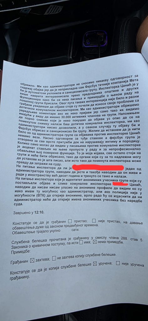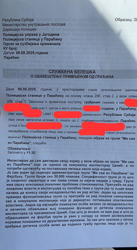 Jutros je jedan od administratora pozvan u PS Paraćin da da izjavu o ovim okolnostima. U nastavku ćemo podeliti sliku izjave koja je javno dostupna na Facebook grupi „Mi svi iz Paraćina“.